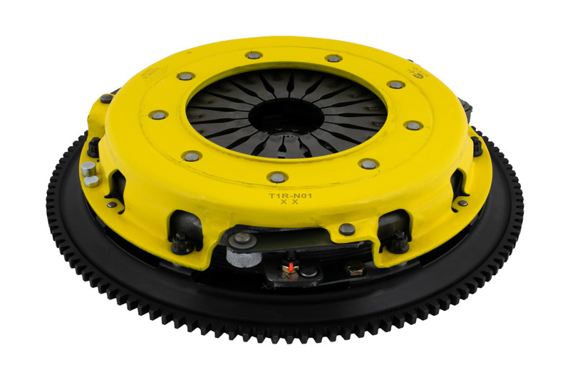 T1R-N01 twin disc kit offers twice the number of disc surfaces for better wear, heat capacity and long life compared to single disc kits. These kits use a proprietary Positive Lift Floater System design, which results in quiet operation with no floater rattle and no posts to wear. ACT twin disc kits endure an exclusive four-stage, heat treating process performed on all diaphragms. The ACT twin disc features the ability to adjust for disc wear and provides equal disengagement for discs. ACT’s 6-pad rigid race discs are made with high quality, ceramic friction materials. The chrome-moly hub is heat-treated for strength and durability. The lightweight, rigid design allows for quicker shifts and trouble-free service. All ACT twin disc kits include a CNC-machined and dynamically balanced flywheel to ensure trouble-free installation and operation. ACT twin disc kits include a pressure plate, two discs, a floater, flywheel and alignment tool. Some kits may include a pilot bearing and release bearing.