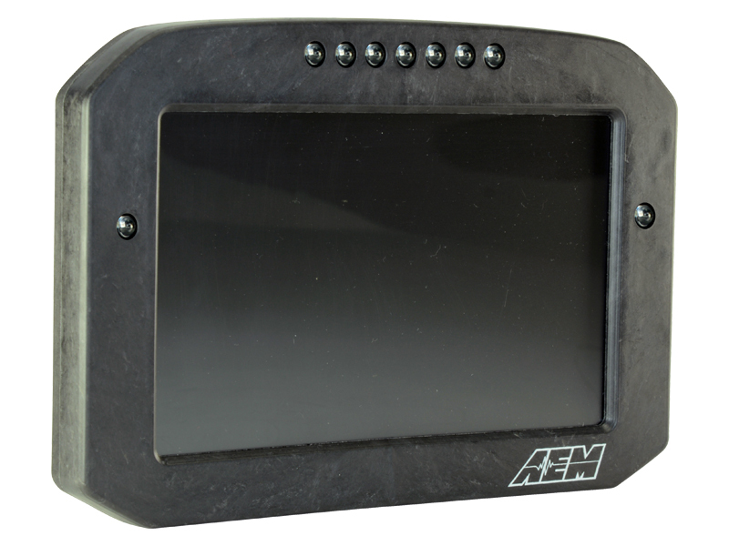 AEM CD7 Carbon Digital Flat Panel Displays feature full-color, daylight readable screens surrounded by a slim, tough, lightweight flow-molded carbon fiber composite housing. Seven ultra-bright LEDs span the top of the display housings for RPM and shift light indication. Users can program them to ascend in specific increments based on RPM range and flash when it is time to shift. Brightness is user programmable on the fixed color LEDs. A remote button kit (PN 30-3610, sold separately) easily wires into the CD Carbon wiring harness and allows users to change pages and clear memory. Two additional programmable LEDs are included in the enclosure and are fully programmable.