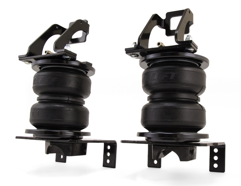 LoadLifter 5000 ULTIMATE adjustable air spring kits feature all of the benefits of our heaviest rated air spring with the addition of an internal jounce bumper inside the spring for the ultimate in ride comfort. An Air Lift exclusive product! Fits vehicles with in-bed hitches. Tow and haul the heaviest loads with safety and comfort with LoadLifter 5000 ULTIMATE. Works with vehicle’s leaf springs to provide up to 5,000 lbs. of rear load leveling capacity and keeps the vehicle riding stable, level and comfortable whether loaded or unloaded. Fully adjustable from 5 to 100 PSI. The closed-cell urethane foam jounce bumper inside the ULTIMATE air springs provide a cushion of air that absorbs shock, eliminates harsh jarring on rough roads and protects vehicles carrying heavy loads. Never bottom out again with the ULTIMATE! LoadLifter 5000 ULTIMATE air springs are maintenance free! Safely run with zero air pressure because of the internal jounce bumper. Replaces factory jounce bumper that is sometimes removed when adding air springs. Requires no drilling into frame! Includes industry-exclusive 60 Day No Questions Money Back Guarantee! Includes the most comprehensive Lifetime Warranty in the industry—covers all kit contents including brackets, fittings and air line. Air springs are built like a tire and are reinforced by durable, 2-ply fabric for maximum strength. Exclusive upper and lower roll plates included. Protect the springs from sharp edges, such as brackets or the frame. The kit includes 2 air springs, brackets, air lines, Schrader valve and all of the hardware needed for installation. Includes fully illustrated instruction manual. Add an Air Lift on-board air compressor system to inflate and deflate air springs with the touch of a button from inside or outside of the vehicle.