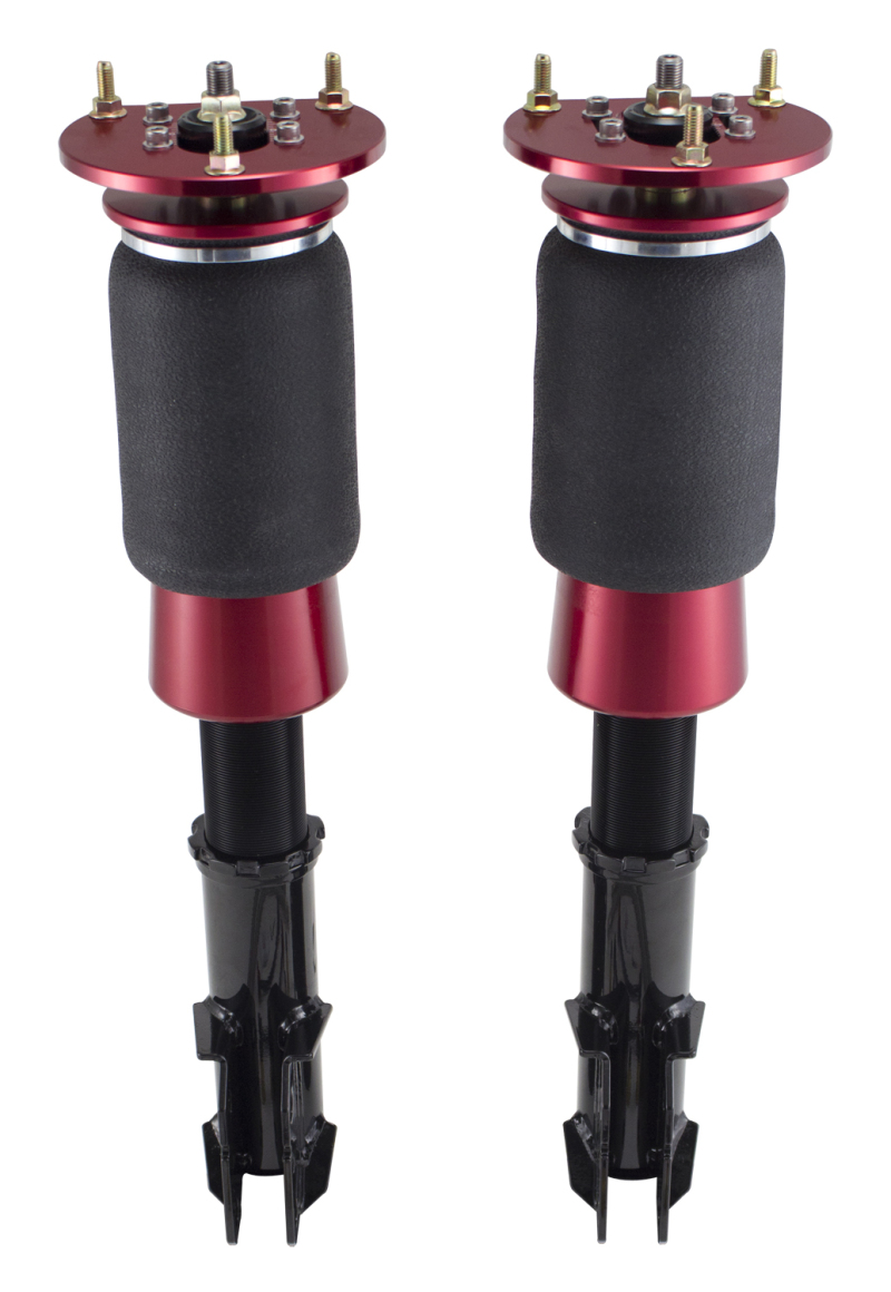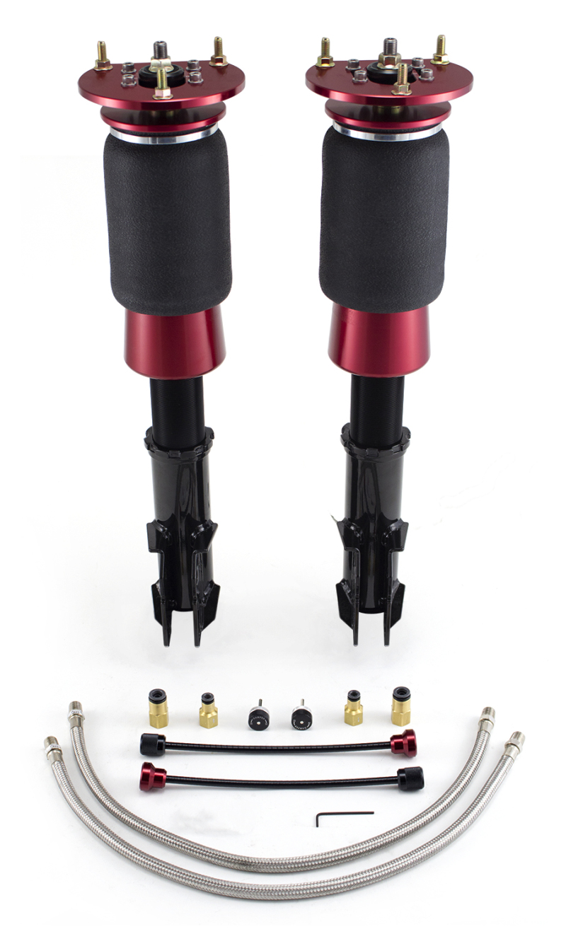 Drop = 4+”; Progressive rate sleeve style springs; 30-way damping adjustable rear air-over shocks; Red anodized aluminum upper mounts