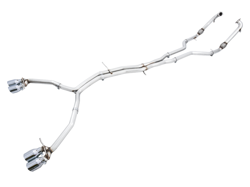The Track Edition Exhaust is equipped with the same precision-engineering as its Touring Edition counterpart, minus the resonators up front and 180 TechnologyA? resonators in the rear. Instead, the Track Edition comes complete with non-resonated downpipes and straight pipe sections — leaving the integrated x-pipe as the only filter. This version is known to get rowdy, and may be too much for many. For that reason, this particular version cannot be returned due to sound preference. Prepare yourself!When it comes to tips, the Track Edition finishes off with 102mm slash-cut tips, featuring the AWE logo, so they know what team you’re on. All tips are individually adjustable, allowing depth into the bumper to be set according to personal taste. They’re also double walled to ensure a mirror finish – even under hard usage. For those who like it loud, go Track.