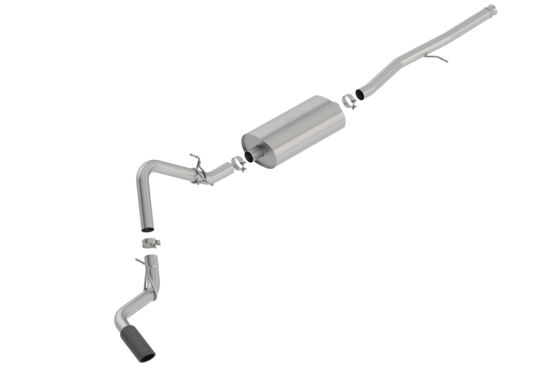 Factory Single Side Exit vehicles ONLY. Add Adapter 60708 for Crew Cab with Standard Bed (6′ 7″) 157″ Wheelbase vehicles. The 140793BC Cat-Back(tm) system by BORLA(r) is a side exit system featuring the mellow Touring sound level and a 4″ black chrome on T-304 stainless steel tip. A bright chrome on T-304 stainless steel tip is also available. Using BORLA(r) Stainless Steel Polish p# 21461 is NOT recommended with these black chrome tips. We suggest cleaning the tips with hot water and a microfiber cloth. Add Adapter 60706 For Crew Cab with Standard Bed (6′ 7″) 157″ Wheelbase vehicles. BORLA(r) Cat-Back(tm) and Axle-Back exhaust systems feature patented straight-through and multi-core technology designed to unleash hidden horsepower. Increased exhaust velocity adds power, driving excitement, fuel economy, and the distinctive BORLA(r) Sound of Power respected by motoring enthusiasts everywhere. Each system is built from premium, high-quality T-304 austenitic stainless steel, superior to T-400 to give you the absolute best in performance and durability. Ultra-smooth mandrel bends ensure maximum flow & power, and precision CNC manufacturing ensures an accurate fit. You can count on BORLA(r) to provide durability, performance, sound, and a Million-Mile Warranty. See separate note about warranty on tip finish.