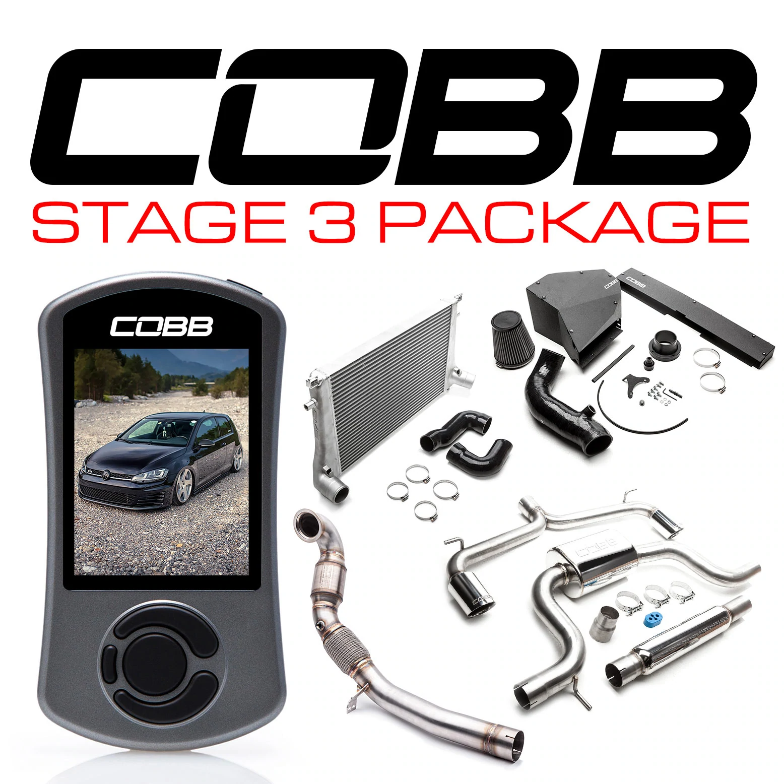 COBB Tuning Volkswagen Stage 3 power packages bundle everything needed to make your GTI even more exciting. Of course, at the top of the list is COBB’s flexible ECU upgrade solution—Accessport V3, that allows you to replace conservative factory settings with more aggressive calibrations. And you can upgrade forever with off-the-shelf calibrations for most bolt-on modifications. Then comes their SF intake system, front-mount intercooler, stainless steel downpipe with flex section and GESi high-flow catalytic converter, and cat-back exhaust. Completing these power-making Stage 3 packages are beautiful OEM-quality chromed COBB vehicle badges that add the finishing touch of performance to your Volkswagen.