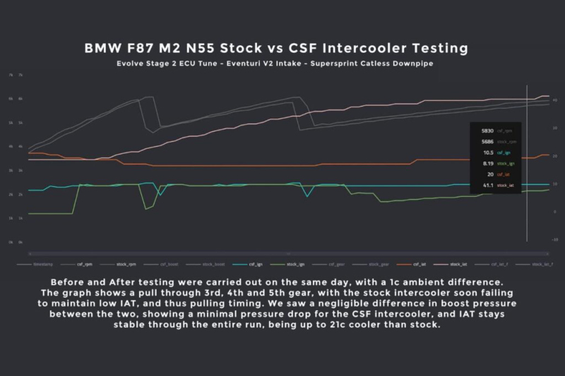 The CSF N55 Intercooler’s Stepped Core Design maximizes surface area contact and internal intake air-flow volume. The Rounded Front Face Bar/Plate Design optimizes airflow through the core and is a true “Drop-in Fit” Plug-and-Play Design. In testing the CSF Intercooler showed Intake Air Temperatures (IATs) that were 38 deg F (21 deg C) lower than factory after just 3 consecutive pulls from 4k RPM to 5.8K RPM. In that test, the CSF Intercooler maintained stable IATs. While most intercoolers don’t offer immediate performance gains without increasing boost pressure, the CSF Intercooler shows an increase of 15-20hp on stock N55 Powered BMW’s and 25+hp on modified examples.