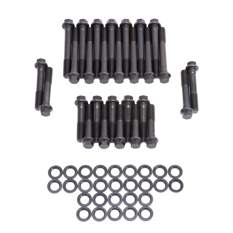 The Edelbrock #8532 bolt kit contain a complete set of the highest quality head bolts and hardened washers available. Cold-formed to ensure molecular integrity and heat treated prior to thread rolling and machining. Reduced diameter bolt heads eliminate the need for valve train removal to facilitate cylinder head re-torqueing. Hardened and parallel-ground washers are included. Rated at 170,000 p.s.i.