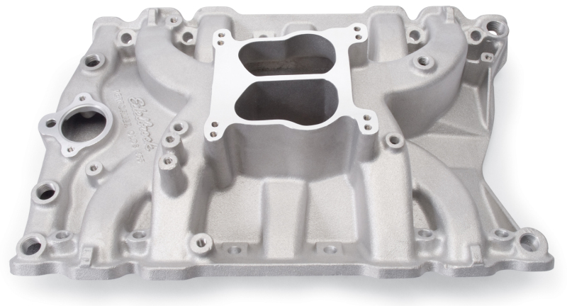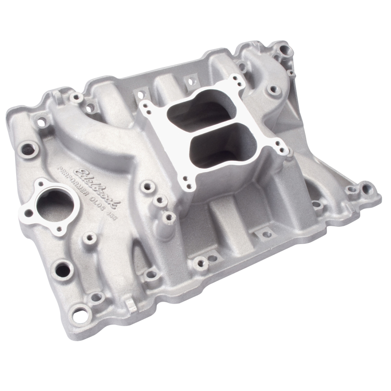 Edelbrock Performer Olds 455 Intake Manifold for 400-425-455 c.i.d. Oldsmobile V8 Engines. Includes Exhaust Crossover Plugs #2733, which Must be used for Marine and Off-Road. Accepts OEM or 4150-Style Carburetors. Non-EGR