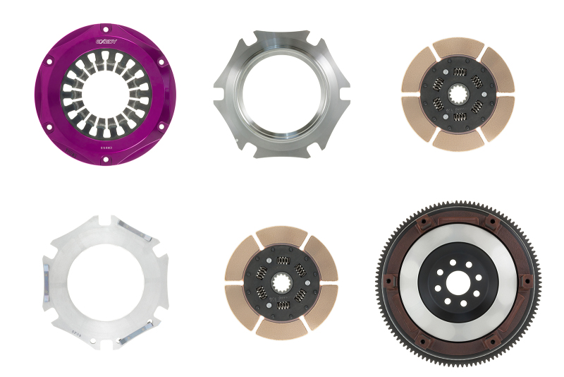 For high-powered applications, EXEDY offers twin and triple Multi-Plate clutches. These are designed for high power street action as well as drag, road and rally racing. The twin plate clutches are rated for approximately 500 ft/lbs of torque and the triple plates are rated for approximately 800 ft/lbs of torque, both figures at the flywheel. Twins come with both spring damper discs or solid discs depending on application, whereas triples are all solid discs and not recommended for street use.