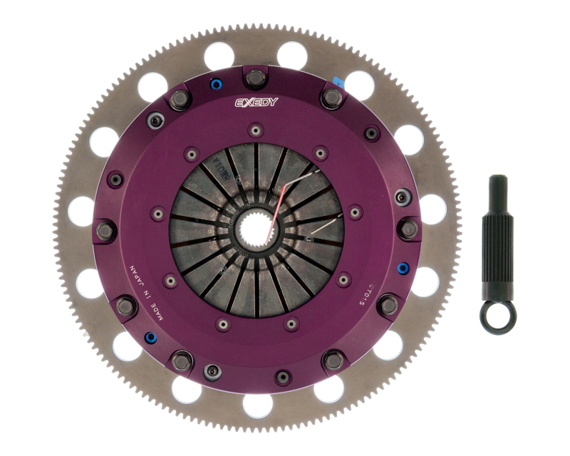 For high-powered applications, EXEDY offers twin and triple Multi-Plate clutches. These are designed for high power street as well as drag, road and rally racing. The twin plate clutches are rated for approximately 500 ft/lbs of torque and the triple plates are rated for approximately 800 ft/lbs of torque, both figures at the flywheel. Twins come with both spring damper discs or solid discs depending on application, whereas triples are all solid discs and not recommended for street use. All EXEDY Hyper Multi-Plate clutches come with a lightweight, chromoly steel flywheel and the famous purple anodized forged aluminum clutch cover. Depending on the application, we have both strap drive and lug drive models. All have T5001 cerametallic friction materials for extreme heat resistance. Surprisingly, even with it?s power capability, multi-plate clutches exhibit light pedal pressure thanks to a half-engaged ”zone” provided by the patented clutch ”cushion” function. SD Type: This model has been developed for high powered street cars and race cars with up to approximately 600TQ at FW. They feature ventilated, thick intermediate plates for improved life and spring damper discs to protect your transmission and driveline. SR Type: These clutch covers are designed to achieve a clamping load that is approx. 40% higher than the stock allowing a higher torque transmitting capacity. Ductile material is used for all pressure plates and, high burst strength can be achieved in all temperature ranges. HR Type: This model has three plates and is developed specifically for high power applications such as over 800 ft/lbs of torque at the flywheel for drag racing. It handles high torque loads and shifts smooth, and because of the lightweight clutch discs, you can reduce your shift times. All EXEDY Racing Hyper Multi Series Clutch Kits carry SFI 1.2/1.5 Certification. Which means, when you buy these products, you can be confident they are certified for use in competitive motorsports.