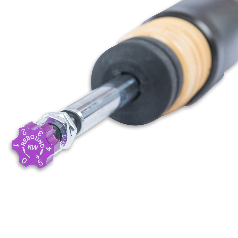 KW V2 INOX-LINE coilovers are the perfect solution for drivers who want more than just outstanding looks and adjustable ride height. In addition to stainless steel coilover struts, and corrosion-resistant components built for long term durability, KW V2 coilovers utilize TVR-A (Twin Valve Rebound – Adjustable) technology that allow Adjustment of the rebound damping characteristics with 16 clicks so you can fine tune the ride comfort or performance to your satisfaction. As with all KW coilovers our engineers develop vehicle specific damper settings that undergo comprehensive testing on the Nurburgring Nordschleife and in our KW 7-post Driving Dynamic Test Center. With a KW coilover kit the driving experience is more dynamic and direct. With the rebound adjustability you have a more direct influence on the handling or comfort of the car. With 16 precise clicks you can adjust the KW dampers (more firm or more comfortable) without affecting the compression damping fine-tuned by our engineers. The two-stage, patented TVR-A (Twin Valve Rebound – Adjustable) technology enables a small volume of oil flow through an adjustable, conically shaped, low-speed bypass during low damper speeds, while at high damper speeds, the main rebound stage valve opens allowing a larger volume of oil to flow. This provides a big improvement in terms of ride comfort without influencing the high-speed range. There are 16 precise clicks available for individual settings, so you can choose between more comfort or more body control. With KW V2 coilovers you can achieve maximum lowering within an approved lowering range that ensures a proper functioning suspension and adequate travel after your car is lowered. Even after years of use you can easily adjust the ride height thanks to the dirt resistant trapezoid thread and composite adjustment collar.