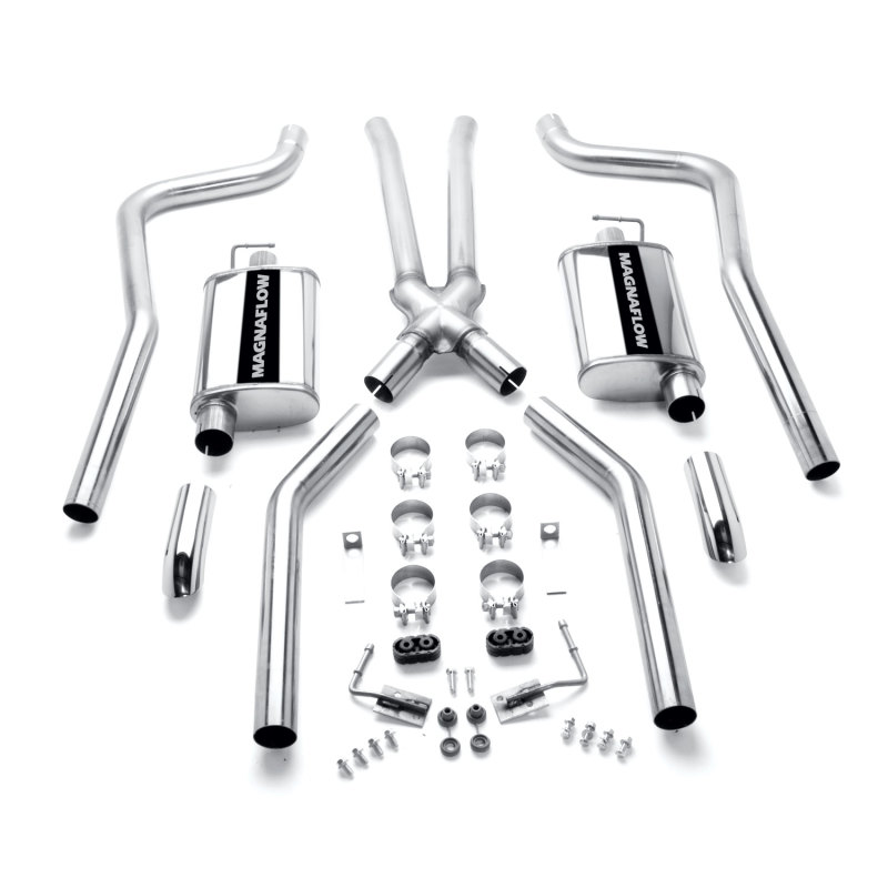 The MagnaFlow Street Series Crossmember-Back Performance Exhaust System 15851 brings enhanced engine sound and dyno-proven performance to your muscle car with a healthy helping of our deep, resonant signature exhaust note at Moderate exterior and Mild interior sound levels. Thanks to its durable, corrosion resistant stainless steel design, this exhaust system will handle whatever tarmac you decide to leave your mark on. This performance exhaust kit features a crossmember-back layout designed to replace your exhaust system from the crossmember on back. With its fast-flowing, mandrel bent 2.5in. main piping and 2 Straight-Through mufflers ending in a Dual Split Rear exit with 2.75in. Polished Welded-On Single Wall Turndown Cut Edge tips, your muscle car will be sounding as awesome as it looks. Extensive 3D scanning during development has resulted in a direct-fit design that you can easily install yourself. 15851 is produced using CNC precision robotic manufacturing techniques and is backed by MagnaFlow’s limited lifetime construction warranty.