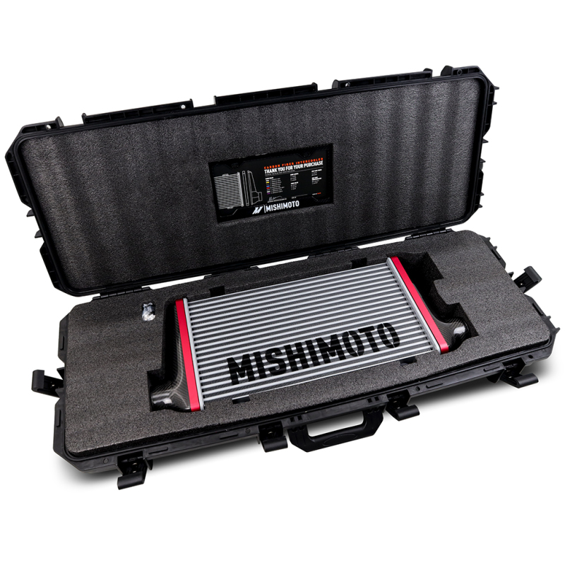 Building a performance vehicle is a quest for balance between opposing needs. Form vs function. Power vs weight. Strength vs lightness. Most of the time, one of those needs is more important to the build, so the other is sacrificed. But here at Mishimoto, we’re done sacrificing. Thanks to our exclusive carbon fiber intercooler, you can have it all: aesthetics, performance, strength, and lightness all rolled into one innovative package. The end tanks are formed from solid 3K twill-woven carbon fiber. Carbon fiber gives our end tanks more strength than aluminum with 70% less weight. Three sizes of custom-engineered cores between the carbon fiber end tanks, combined with 3-inch inlets optimized for flow, ensure our intercooler is up to the task for builds producing up to 950 horsepower and 32 PSI of boost. The one-of-a-kind V-band core clamps hold the end tanks tight to the core under boost without the use of adhesives that can fail after repeated heat cycles. To ensure the end tanks can hold up to the rigors of road or track, they’ve been independently laboratory tested to SAE J400 standards for gravel impacts. With the Mishimoto carbon fiber intercooler, you don’t have to sacrifice performance or strength for lightness. Carbon fiber isn’t just strong, it’s one of the most stunning raw materials available. Nothing beats the look of precisely woven carbon fiber
