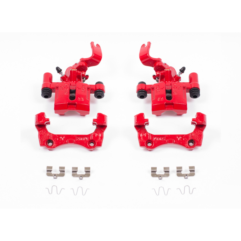 PowerStop Brake Calipers are made specifically with the enthusiast in mind. These calipers bolt directly in place of the stock calipers, and they look and perform great behind stock or custom wheels. PowerStop calipers and the brackets are remanufactured in our Chicago, IL facility and treated with a electrostatic high-temperature red powder-coating. The easy to clean powder coating helps to resist rust and corrosion thus extending the life of your calipers. PowerStop calipers are 100% pressure tested to verify piston operation and prevent any possible leaks from occurring. This ensures that every caliper is inspected for quality and safety. PowerStop caliper pairs are expertly assembled using new seals, caliper guide pins, dust boots, bleeder screws, stainless steel brake pad abutment clips and mounting brackets. Our manual parking brake calipers are provided as a complete assembly to include all adjusting hardware, actuating levers, return springs, clips and bolts. High temperature EPDM rubber dust boots and premium silicone lubricant is used for a smoother operation and an extended life in extreme conditions. The color is a nice touch that really stands out behind your wheels!