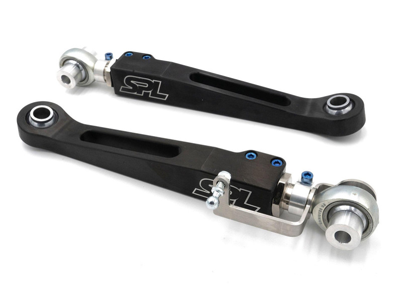 BMW F2X/F3X Front Lower Control Arms (FLCA) provide roll center, camber, and track width adjustment for the BMW F2X/F3X, and allow for full articulation with the proper ball joint angle. The main arm is slotted to allow the use of pinch bolts, and our rotating clamps on SPL Parts’ exclusive Double Adjuster lock down camber and track width settings. No more jam nuts!! Long gone are the days of fumbling with multiple wrenches to tighten jam nuts in place while trying to keep your bearings oriented correctly. Our Double Adjuster is machined from 4130 Chromoly, gun drilled to reduce weight, then electroless nickel plated for corrosion resistance. Blue Anodized Titanium hardware shaves even more unsprung weight from the arms without compromising strength. Stainless Steel spacers are provided to correct roll center for lowered vehicles