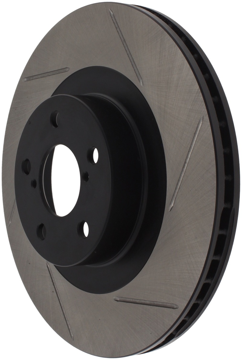 StopTech Slotted Sport Rotors are 1-piece direct replacement brake discs for factory brake systems and stock calipers that look great behind your wheels a** and offer significantly improved braking performance. The unique slotting aids with heat and brake dust dispersal; prevents glazing of the pads; adds bite and improves wet and dry braking performance. Built to last; the black e-coating provides protection from corrosion and the high carbon metallurgy (in most applications) offers quieter operation; better crack resistance and increased performance.