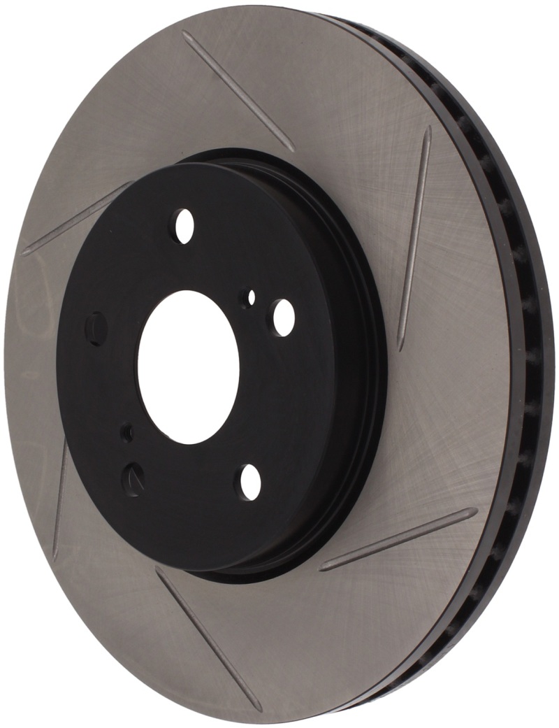 StopTech Slotted Sport Rotors are 1-piece direct replacement brake discs for factory brake systems and stock calipers that look great behind your wheels a** and offer significantly improved braking performance. The unique slotting aids with heat and brake dust dispersal; prevents glazing of the pads; adds bite and improves wet and dry braking performance. Built to last; the black e-coating provides protection from corrosion and the high carbon metallurgy (in most applications) offers quieter operation; better crack resistance and increased performance.
