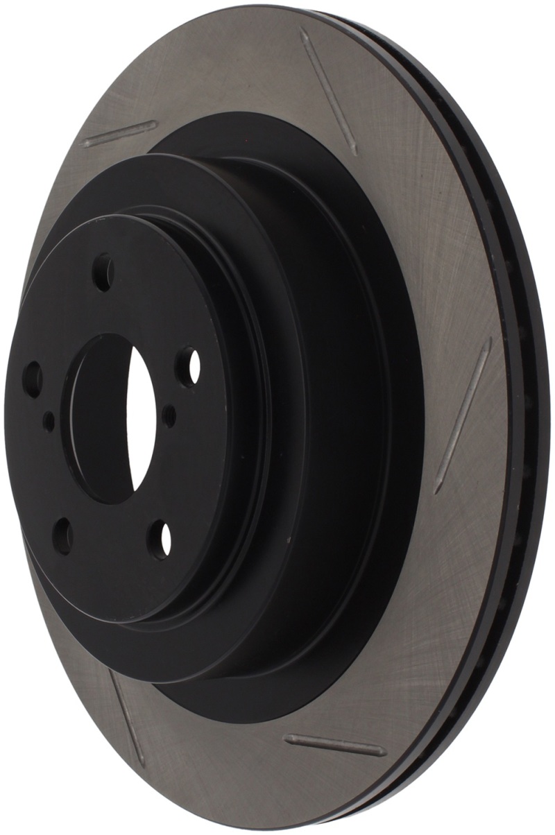 StopTech Slotted Sport Rotors are 1-piece direct replacement brake discs for factory brake systems and stock calipers that look great behind your wheels a** and offer significantly improved braking performance. The unique slotting aids with heat and brake dust dispersal; prevents glazing of the pads; adds bite and improves wet and dry braking performance. Built to last; the black e-coating provides protection from corrosion and the high carbon metallurgy (in most applications) offers quieter operation; better crack resistance and increased performance.