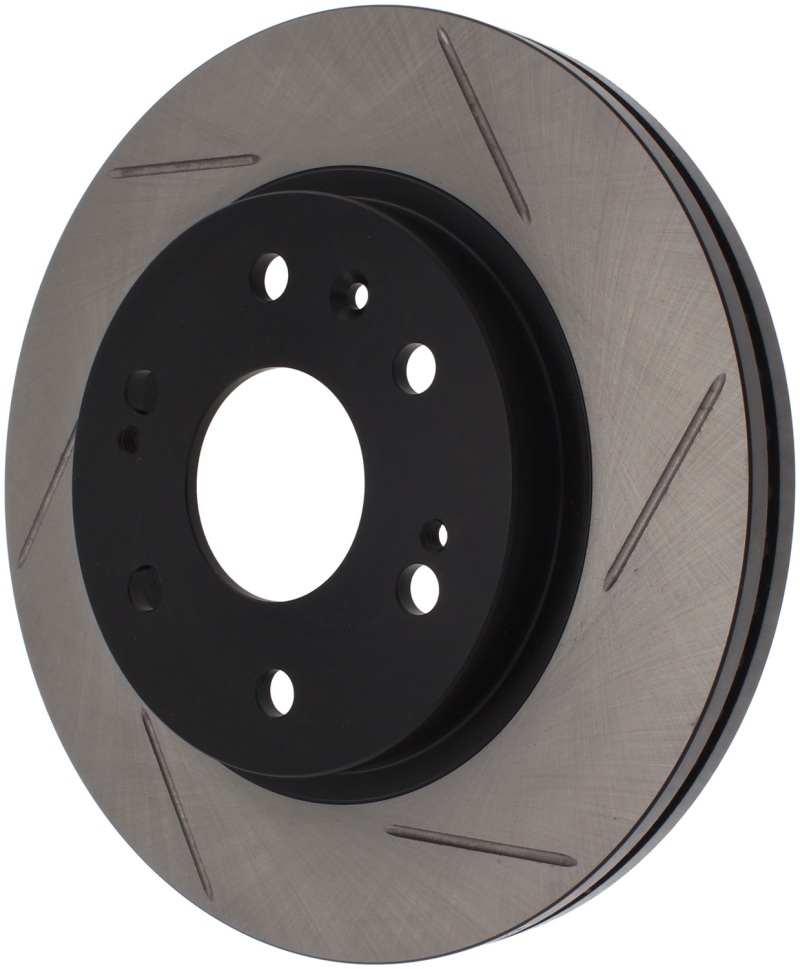 StopTech Slotted Sport Rotors are 1-piece direct replacement brake discs for factory brake systems and stock calipers that look great behind your wheels a** and offer significantly improved braking performance. The unique slotting aids with heat and brake dust dispersal; prevents glazing of the pads; adds bite and improves wet and dry braking performance. Built to last; the black e-coating provides protection from corrosion and the high carbon metallurgy (in most applications) offers quieter operation; better crack resistance and increased performance.