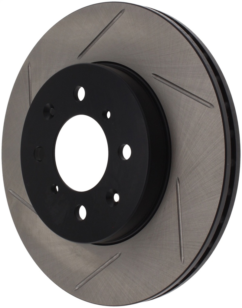 StopTech Slotted Sport Rotors are 1-piece direct replacement brake discs for factory brake systems and stock calipers that look great behind your wheels a** and offer significantly improved braking performance. The unique slotting aids with heat and brake dust dispersal; prevents glazing of the pads; adds bite and improves wet and dry braking performance. Built to last; the black e-coating provides protection from corrosion and the high carbon metallurgy (in most applications) offers quieter operation; better crack resistance and increased performance.
