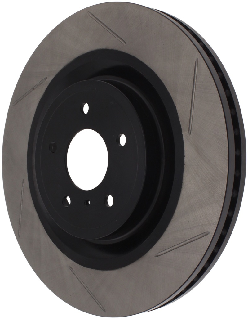 StopTech Slotted Sport Rotors are 1-piece direct replacement brake discs for factory brake systems and stock calipers that look great behind your wheels a** and offer significantly improved braking performance. The unique slotting aids with heat and brake dust dispersal; prevents glazing of the pads; adds bite and improves wet and dry braking performance. Built to last; the black e-coating provides protection from corrosion and the high carbon metallurgy (in most applications) offers quieter operation; better crack resistance and increased performance.
