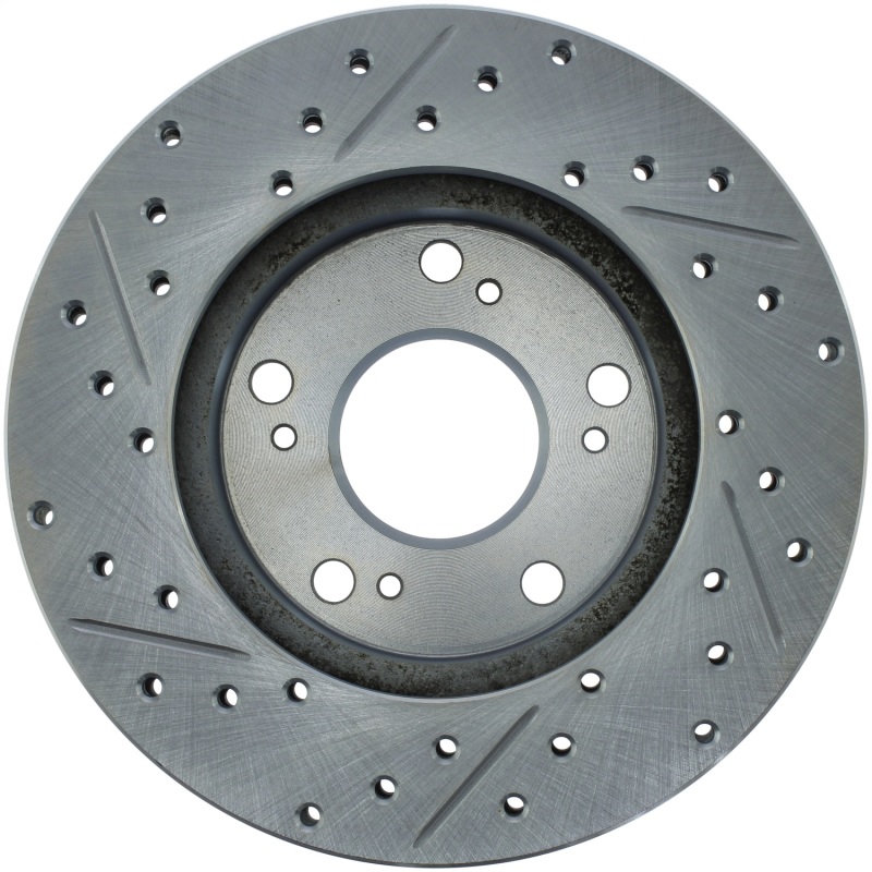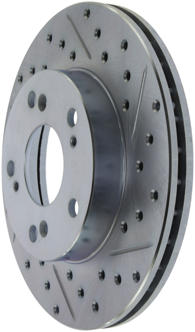 StopTech Drilled and Slotted Sport Rotors are 1-piece direct replacement brake discs for factory brake systems and stock calipers that look great behind your wheels a** and offer significantly improved braking performance. The unique cross-drilling and slotting aids with heat and brake dust dispersal; prevents glazing of the pads; adds bite and improves wet and dry braking performance. Built to last; the black e-coating provides protection from corrosion and the high carbon metallurgy (in most applications) offers quieter operation; better crack resistance and increased performance.