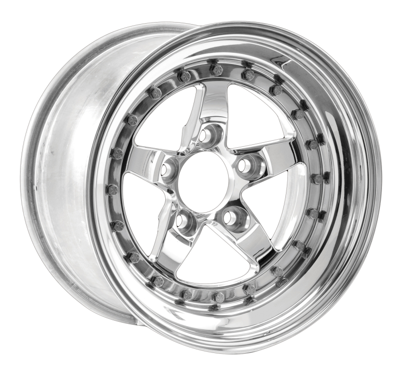 Polished center; 3-piece bolted construction for superior strength to weight ratio; wheel widths from 4.5” to 18”; requires shank lug nuts; center cap and valve stem included; made in Kansas City, MO USA