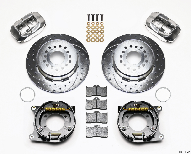 This group of FDL Pro-Series rear disc kits provides a complete solution for popular muscle car rear axles that require a parking brake. Forged billet Dynalite four piston calipers, 12.19″ one-piece drum/rotors, and high friction pads provide optimized an